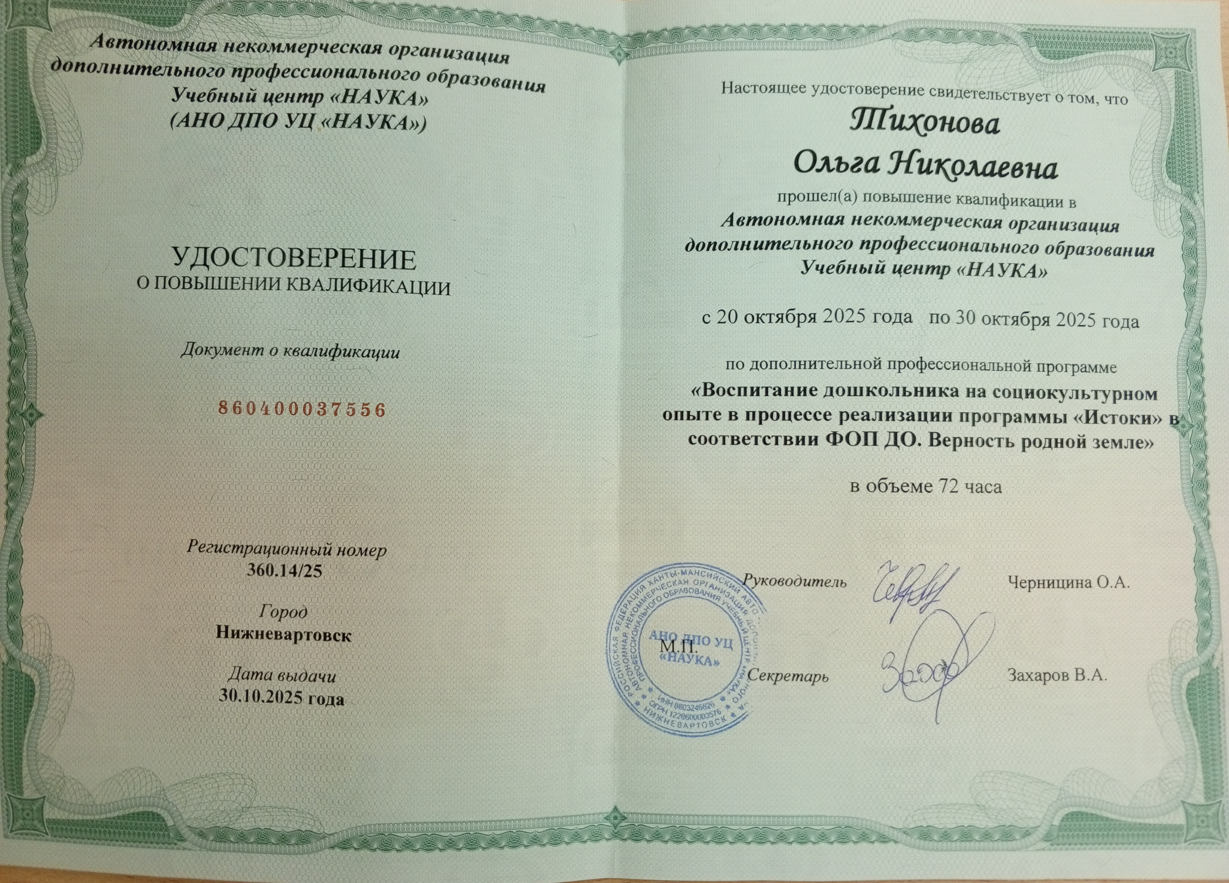 Удостоверение о повышении квалификации по программе "Духовно - нравственное воспитание детей в условиях реализации программы " Социокультурные Истоки""